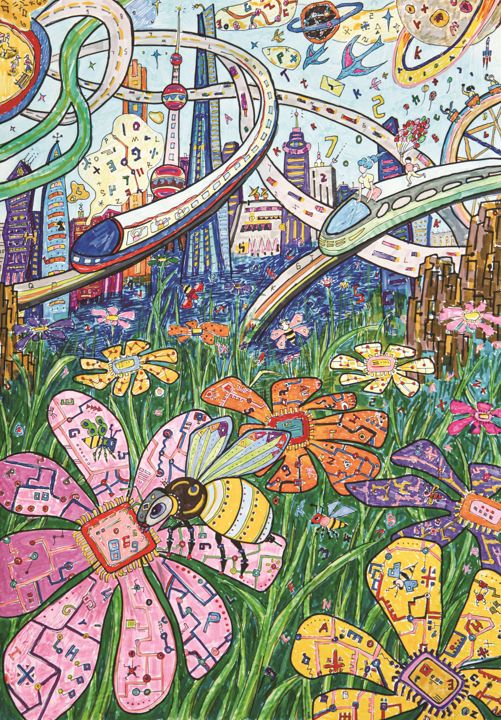 小学组获奖代表葛奕新的作品《科幻浦东·数字家园》充满了对未来的想象。她略带腼腆地分享创作灵感:“我想让未来的浦东更加科幻、更加特别——有亮晶晶的高楼,也有在空中飞驰的高铁。未来的花园里,开满由电子芯片和集成电路组成的奇幻花朵,机器小蜜蜂辛勤采集着花朵里的数字营养,来滋养我们的城市和生活。”